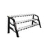 重い負荷に耐える3段階のダンベルラックは、15組のダンベルを収納できます。半円形のラバーサドルが、ダンベルをラックに置く際の耐久性と安全性を提供します。